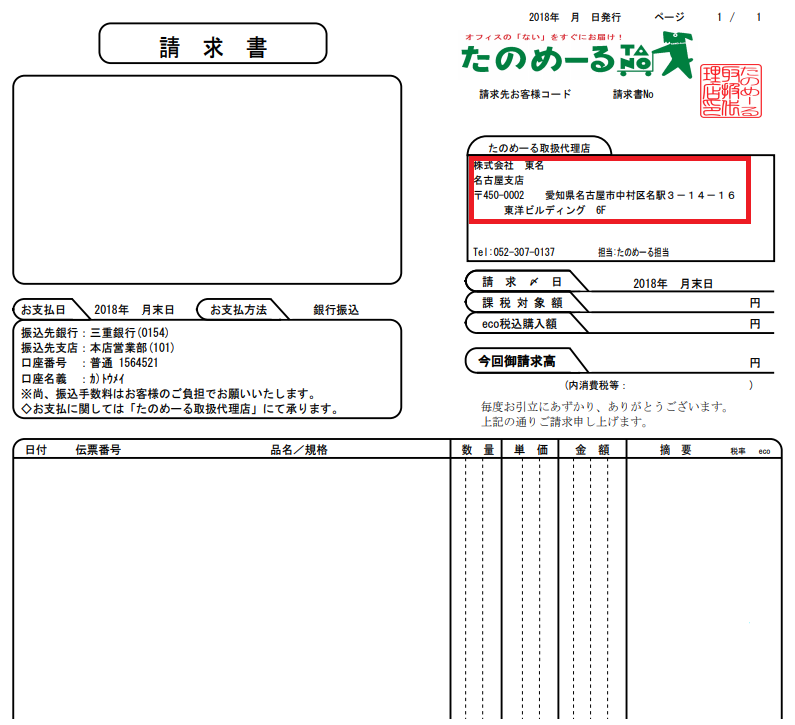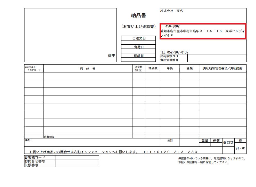 ご請求書、納品書等に弊社の住所「〒450-0002 愛知県名古屋市中村区名駅三丁目14番16号 東洋ビルディング6F」