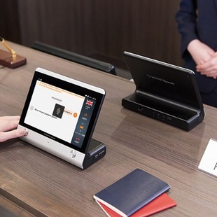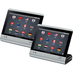 2台1組の対話形式で円滑なコミュニケーションを実現。場所を選ばないシンプルな外観でホテルのフロントや施設窓口で多言語対応に理想的な翻訳機です。